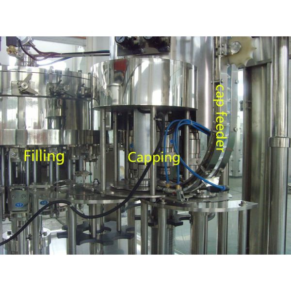 The bottle enters into the rinsing part of three-in-one machine through air conveyor. The gripper installed on the rotary disk catches bottle and turns it over 180 degrees and makes the bottleneck face ground. In the special rinsing area, the nozzle on the gripper sprays juice to rinse bottle inwall. After rinsing and draining, the bottle turns over 180 degrees along the guide rail and make the bottleneck faces sky. Then rinsed bottle is transferred to the filling part through poking bottle starwheel. The bottle that enters into the filler is hold by neck holding plate. The filling valve acted by the cam can realize up and down. It adopts equal pressure filling way. The filling valve opens and begins filling when it moves down and touches thebottleneck, the filling valve move up and leave the bottleneck when it finishes filling, the full bottle is transferred to the capping part through hold neck transition poking wheel. The stop screwing knife holds the bottleneck, keeps bottle upright not rotating. The screw capping head keeps in revolution and autorotation. It can finish a whole capping course including catching, pressing, screwing, discharging through the action of the cam. The full bottle is transferred to bottle outlet conveyor to the next process through starwheel. The whole machine is enclosed with windows, the height of enclosed window is higher than the peak of the 3 in 1 machine, in the bottom of the enclosed window has return air outlet.